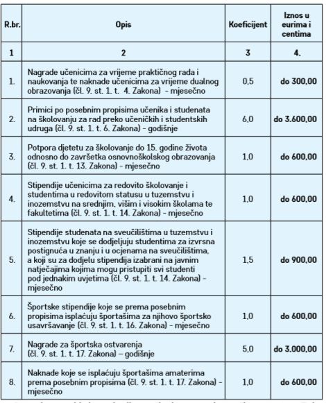 · oporezivim primicima fizičkih osoba koje ostvaruju drugi dohodak iz članka 39. Zakona ne smatraju se primici koje isplaćuju isplatitelji do propisanih iznosa izračunatih primjenom propisanih koeficijenata na iznos osnovnog osobnog odbitka iz članka 14. stavak 1. odnosno na iznos od 600,00 eura, i to kako slijedi: