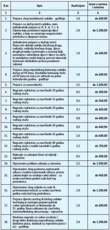 Isto tako, a u skladu s odredbama članka 9. stavak 1. točka 9., 13. i 24. Zakona, oporezivim primicima po osnovi nesamostalnog rada ne smatraju se primici koje poslodavac ili isplatitelj plaće isplaćuje svojim radnicima iz r.br. 1. - 18. do visine iznosa izračunatog primjenom propisanih koeficijenata na iznos osnovnoga osobnog odbitka od 600,00 eura, i to: