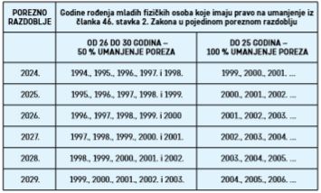 Pravilnikom o izmjenama je u članku 58. stavak 6. Pravilnika ažurirana tablica s godinama rođenja mladih fizičkih osoba koje, sukladno članku 46. stavak 2. Zakona, imaju pravo na umanjenje godišnjeg poreza na dohodak, i to kako slijedi: